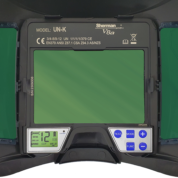 Przyłbica V8a umożliwia regulację stopnia zaciemnienia od 4 do 12 wg DIN, płynną regulację czułości reakcji fotoczujników na intensywność łuku podczas spawania, a także regulację czasu opóźnienia przełączania stanu ciemny/jasny i zmianę trybu pracy na szlifowanie. Filtr zaciemniający posiada najwyższą klasę optyczną zapewniając pełne bezpieczeństwo spawacza. Wyposażony jest w cztery fotoczujniki, co ma szczególne znaczenie podczas spawania niskimi prądami.