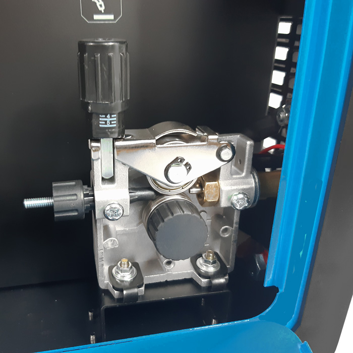 Spawarka umożliwia podłączenie uchwytu typu Spool Gun (SG) z zamontowanym w nim mini podajnikiem drutu i szpulą D100 drutu stalowego lub kolorowego.