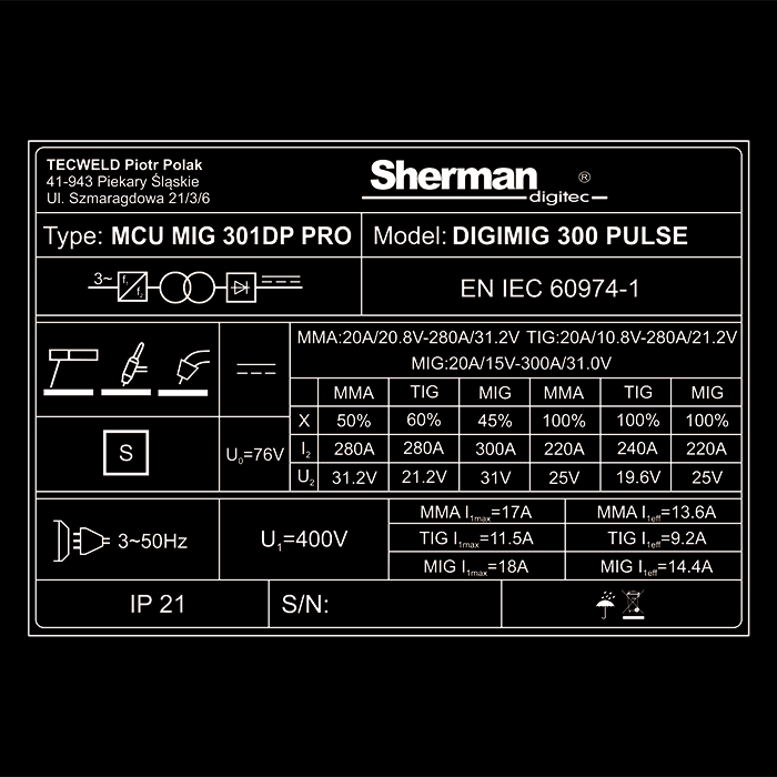 Synergiczny inwertor IGBT, prąd spawania 300A (45%), 4R, sterowanie cyfrowe, zasilanie AC 3x400V 50Hz, MIG, MMA, Lift TIG, puls, podwójny puls