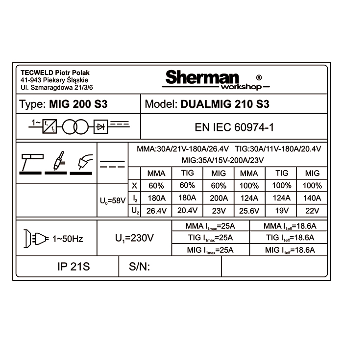 Inwertor IGBT, prąd spawania 200A (60%), zasilanie AC 230V 50Hz, MIG, MMA, TiG Lift