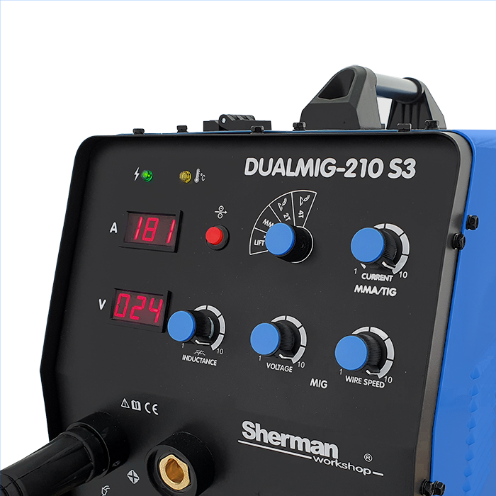 Spawarka półautomatyczna DUALMIG 210 S3 służy do spawania ręcznego stali i metali kolorowych. Umożliwia spawanie metodami MIG/MAG, MMA (elektrodą otuloną) i Lift TIG. Stosowana może być również do lutospawania cienkich (do 3mm) blach ocynkowanych. Dzięki zmianie polaryzacji urządzenie pozwala spawać metodą MIG/MAG z zastosowaniem zarówno standardowych drutów w osłonie gazów ochronnych, jak i samoosłonowych drutów proszkowych. Spawarka znajduje zastosowanie w pomieszczeniach zamkniętych lub zadaszonych, nienarażonych na bezpośrednie działanie czynników atmosferycznych. DUALMIG 210 S3 współpracuje ze szpulami drutu D200 (5kg) i D300 (15kg).