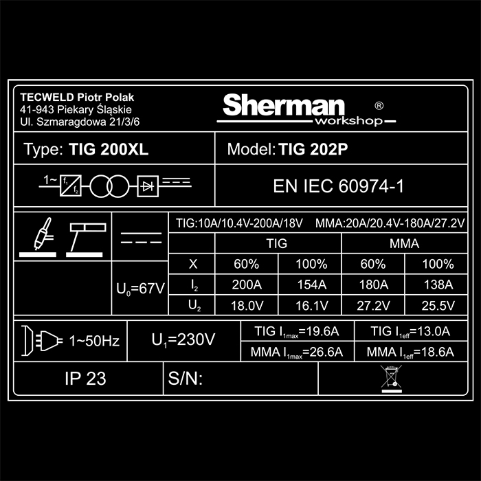 Inwertor IGBT, prąd spawania 200A (60%), zasilanie AC 230V 50Hz, TIG DC, MMA