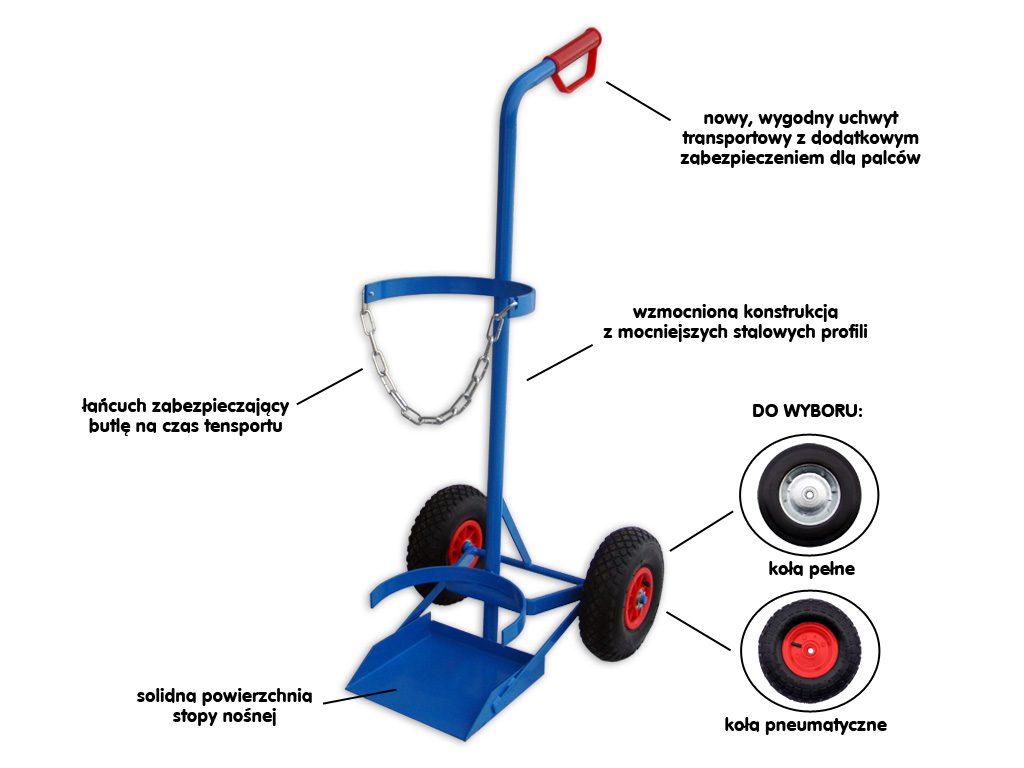 Wózek do transportu butli gazowych. Solidna, stalowa konstrukcja, zabezpieczenie butli przed spadaniem za pomocą łańcucha.
