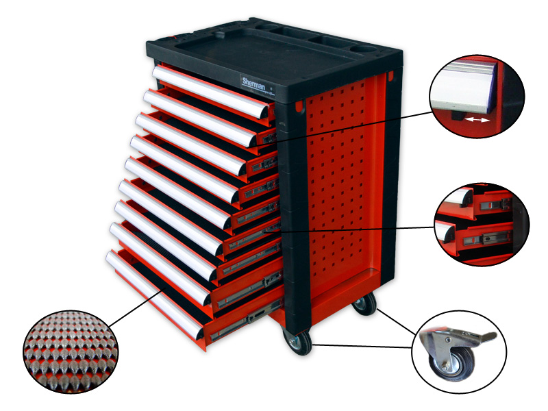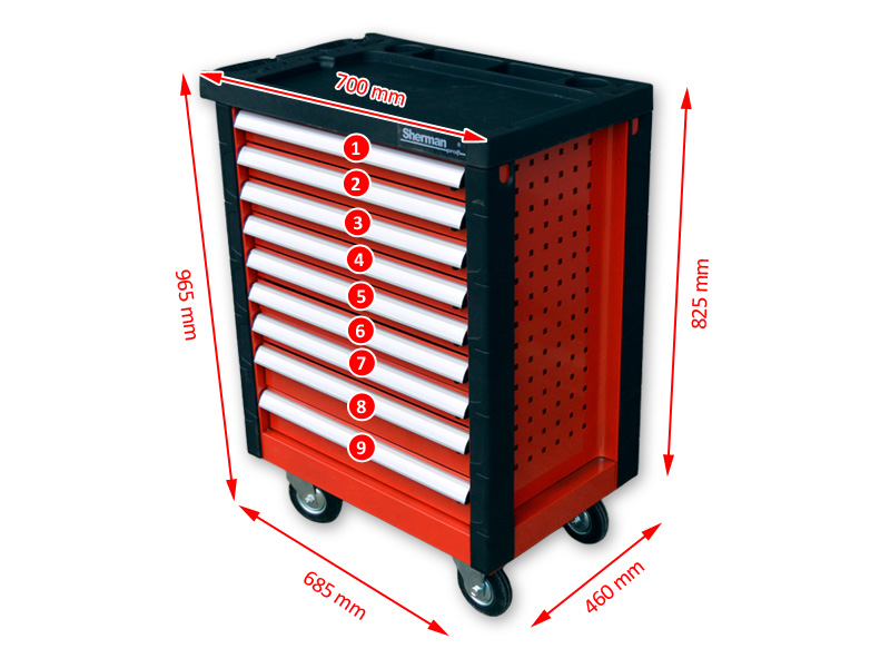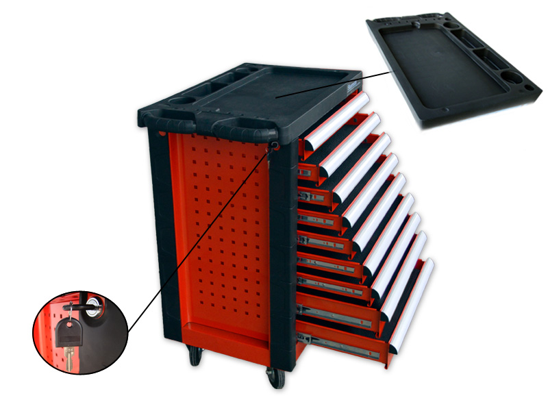 Stalowy wózek z dziewięcioma wysuwanymi szufladami na łożyskach rolkowych. Posiada dwa skrętne koła z hamulcem oraz naroża i blat roboczy wykonany z tworzywa sztucznego. Wózek wyposażony jest w mechanizm pozwalający równocześnie zamknąć na zamek wszystkie szuflady. Dodatkowo każda szuflada posiada mechanizm blokujący, zabezpieczający ją np. przed przypadkowym otwarciem. Świetnie sprawdza się w warsztatach, serwisach, garażach.