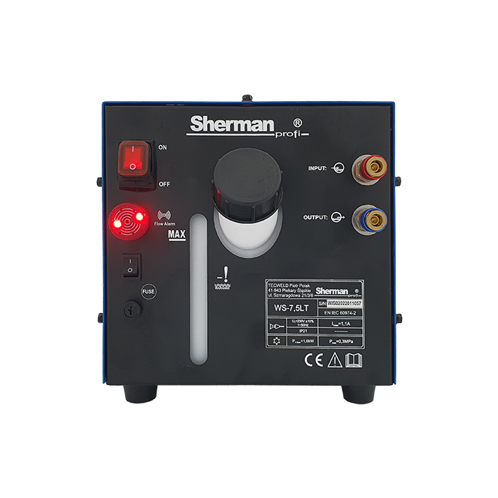 Chłodnica WS-7,5LT dedykowana jest do współpracy ze spawarką Sherman-profi TIG 320 AC/DC pulse i przeznaczona jest do chłodzenia cieczą uchwytów spawalniczych TIG, możliwe jednak jest zastosowanie jej do innych urządzeń i podzespołów wymagających chłodzenia w obiegu zamkniętym. Zaleca się ustawienie chłodnicy pod spawarką. W zestawie znajduje się komplet mocowań umożliwiających takie ustawienie. W budowie chłodnicy wykorzystano komponenty sprawdzonej chłodnicy WRC-300B, zmianie uległa odbudowa oraz zbiornik płynu. Zastosowanie wymiennika ciepła zbudowanego na miedzianej wężownicy i pompy ze stali nierdzewnej zdecydowanie zwiększają skuteczność chłodzenia oraz przedłużają żywotność urządzenia.