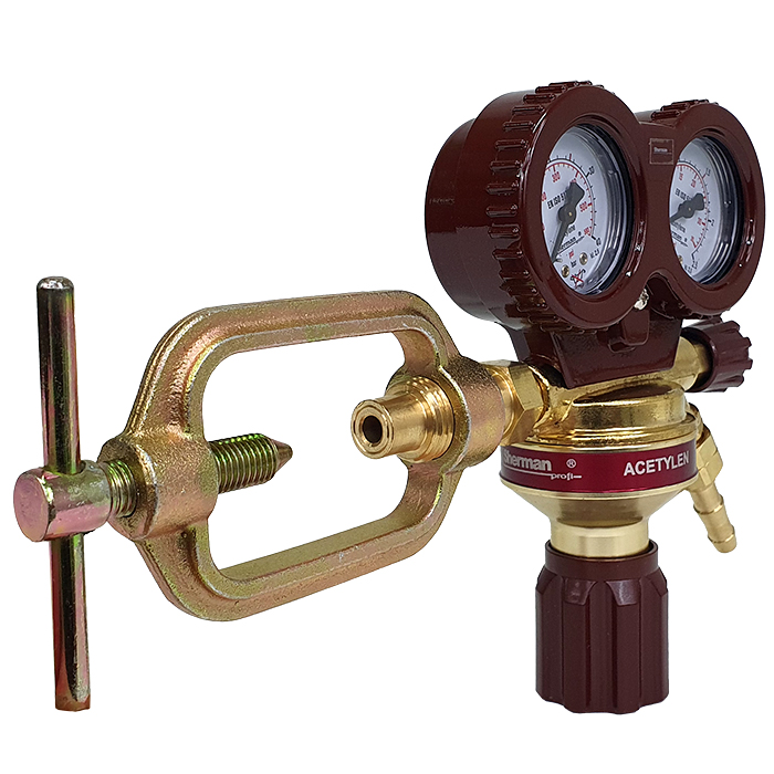 Reduktor z dwoma manometrami z regulacją ciśnienia wylotowego. Pozwala na obniżanie ciśnienia gazów pobieranych z butli do wymaganego ciśnienia wylotowego (roboczego) oraz zapewnia samoczynne utrzymanie tego ciśnienia na możliwie stałym poziomie niezależnie od zmian ciśnienia wlotowego. Reduktor wyposażony jest w zawór odcinający pozwalający na zamknięcie wypływu gazu z reduktora bez zmiany jego nastawy. Posiada także zawór bezpieczeństwa, przez który przy wzroście ciśnienia wylotowego ponad dopuszczalne zostaje wypuszczony nadmiar gazu z komory ciśnienia wylotowego na zewnątrz.