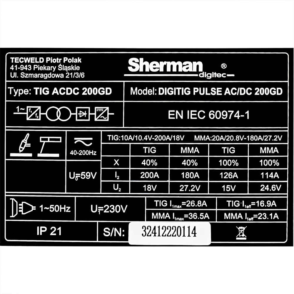 Inwertor IGBT, prąd spawania 200A (40%), zasilanie AC 230V 50Hz, TIG AC/DC, MMA, sterowanie cyfrowe