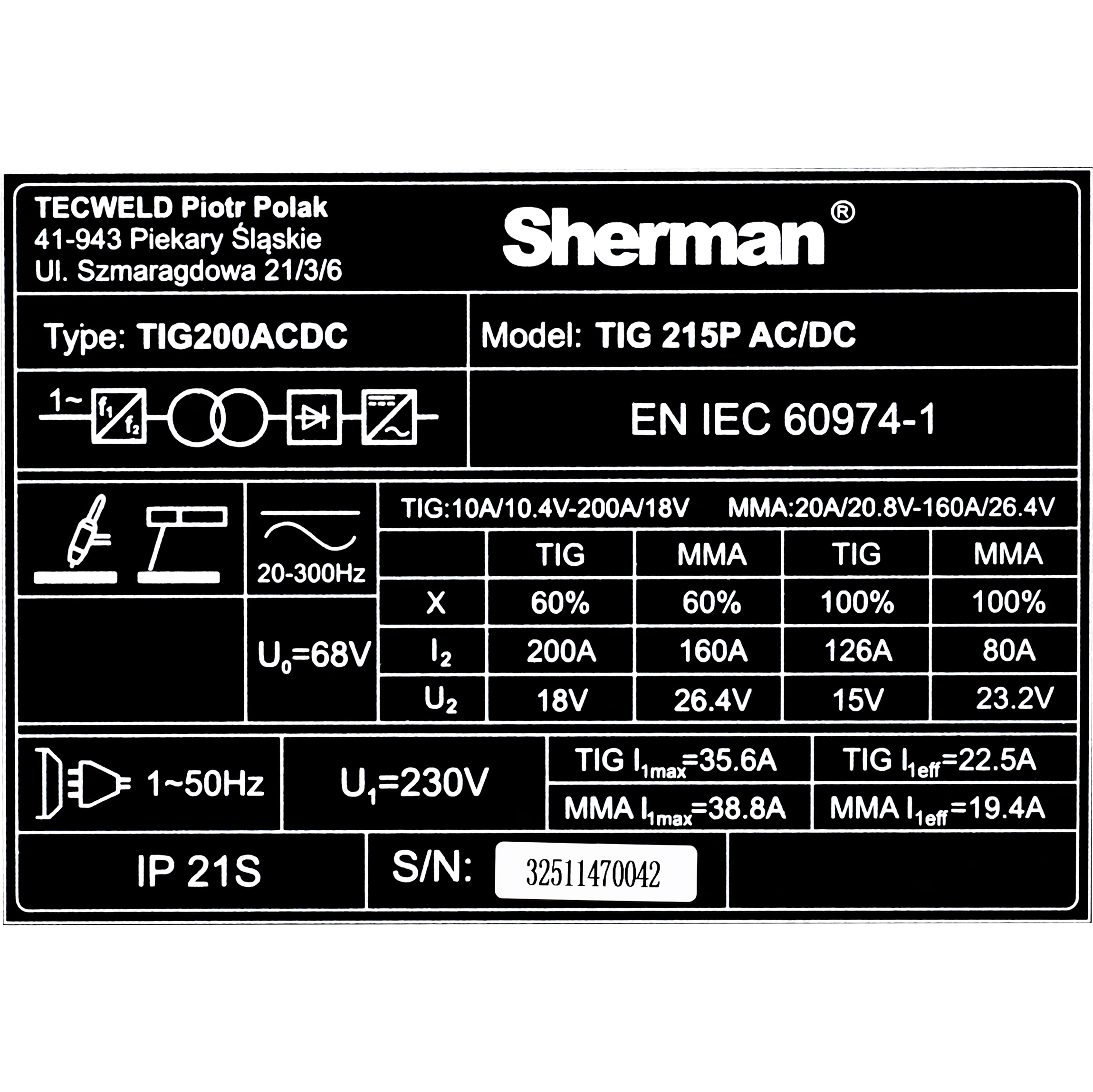 Inwertor IGBT, prąd spawania 200A (60%), zasilanie AC 230V 50Hz, TIG AC/DC, MMA, puls.