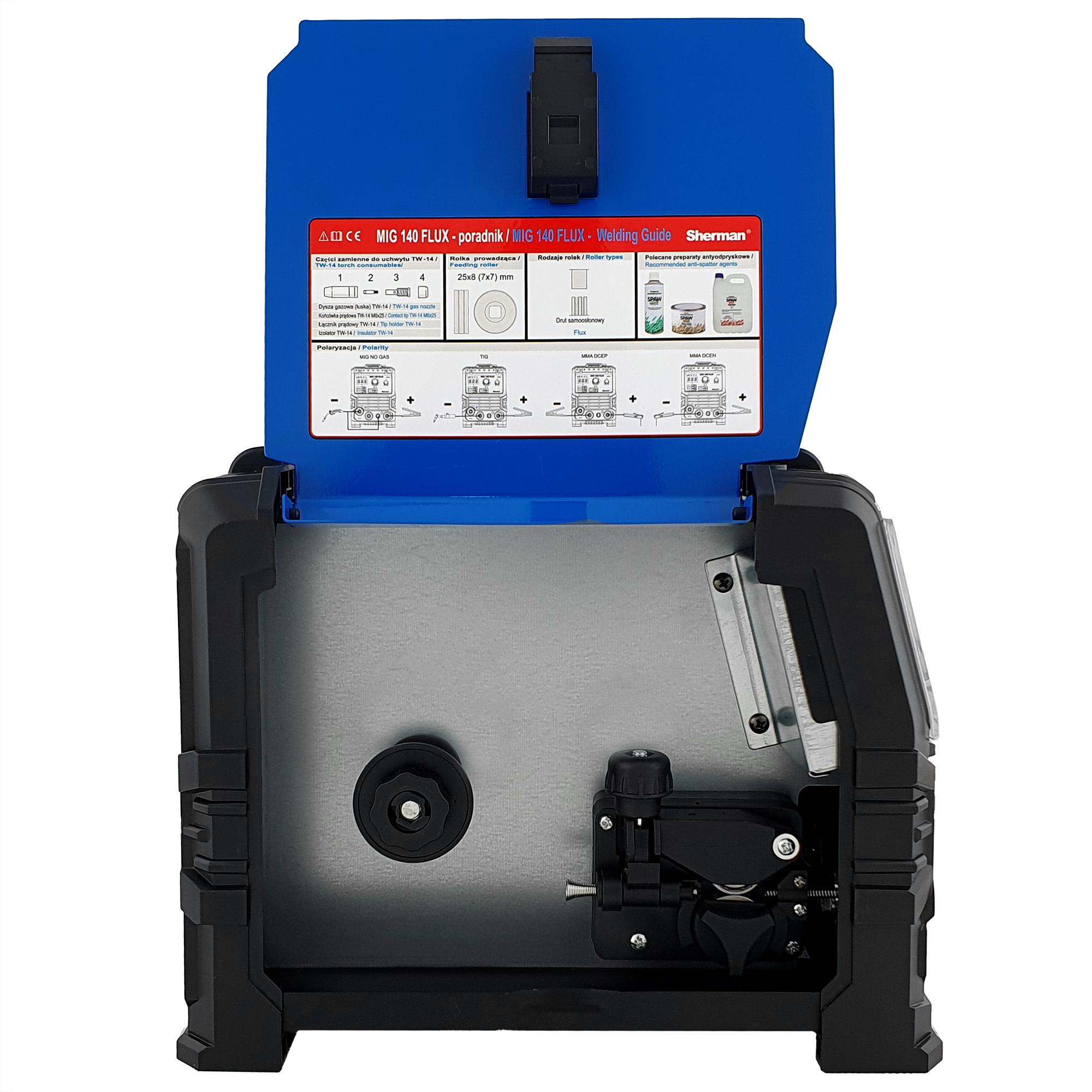 | Funkcje | Podajnik 2-rolkowy, Spawanie bez gazu, Sterowanie cyfrowe, Wyświetlacz LED, Synergia drut samoosłonowy |