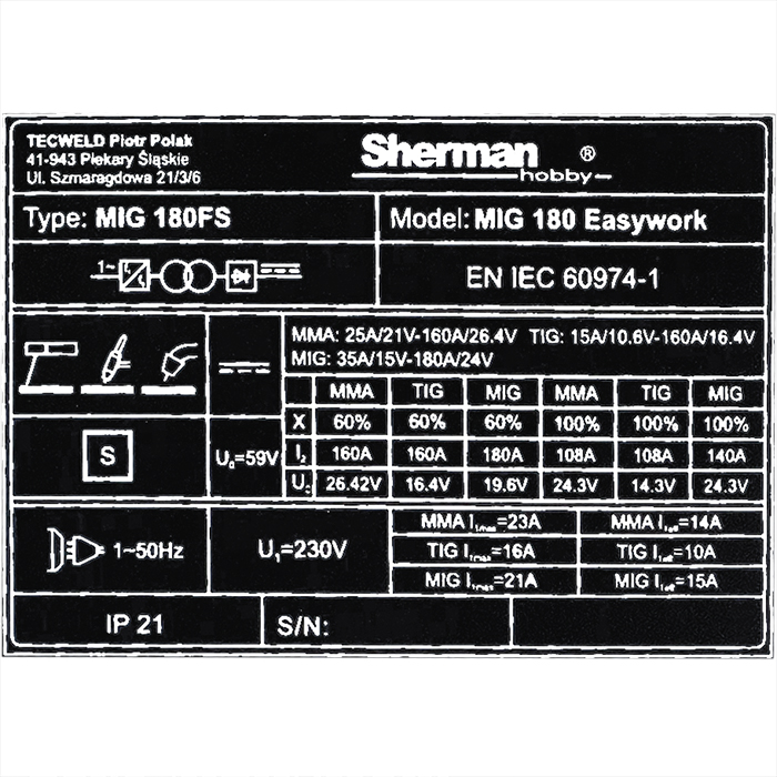 Inwertor IGBT, prąd spawania 180A (60%), zasilanie AC 230V 50Hz, MIG, TIG, MMA