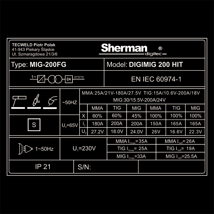 Synergiczny inwertor IGBT, prąd spawania 200A (45%), sterowanie cyfrowe, zasilanie AC 230V 50Hz, MIG, MMA, Lift TIG