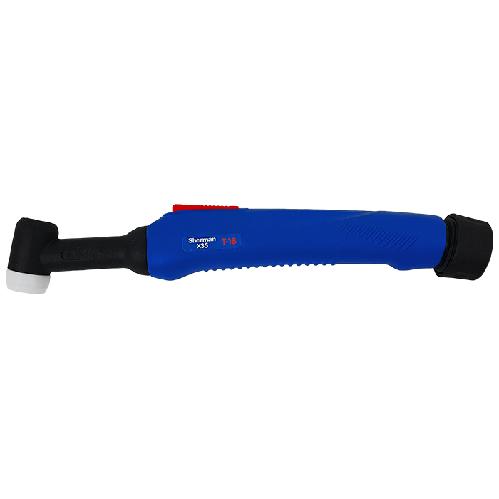 Uchwyt spawalniczy T-18 serii Sherman X35 (ze sztywną główką palnika) to uchwyt chłodzony cieczą do spawania metodą TIG (elektrodą nietopliwą).Przewody sterownicze nie posiadają wtyczek sterujących. Do każdego uchwytu dodawane są części eksploatacyjne zawierające: korek długi i korek krótki, dyszę, łącznik prądowy i tulejkę zaciskową.